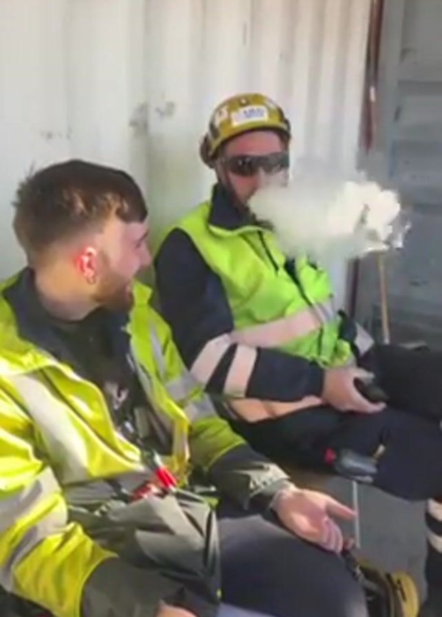 Two men in yellow work vests and dark pants are sitting side-by-side on what looks like a metal container's stoop. The man on the right wears a yellow hardhat with sunglasses, and he exhales a large cloud of white vapor. The man on the left watches him and smiles. Both men are casually sitting, with their legs spread. The environment looks like a construction site, and there is a sign with text hanging on the wall behind them.
