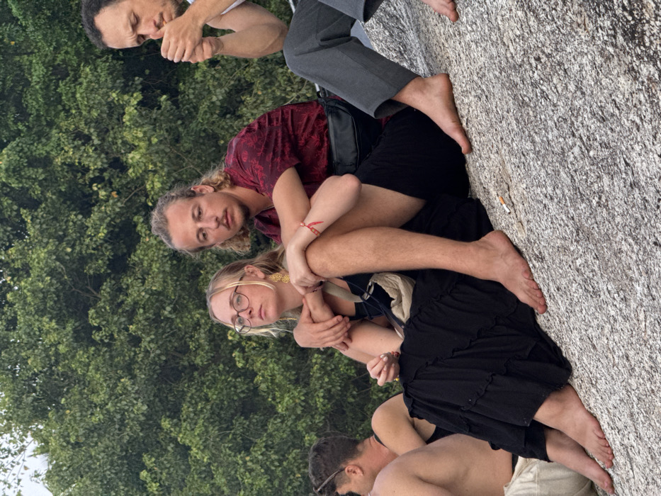 Several people are gathered on a rock. A man in a red shirt and black shorts sits above a woman in glasses and a black dress, their arms intertwined. Above him, a man in a white shirt and gray pants is visible. Below the woman, part of another person is visible. Everyone is barefoot on the rock, and a cigarette butt is near their feet. Dense green foliage appears in the background.