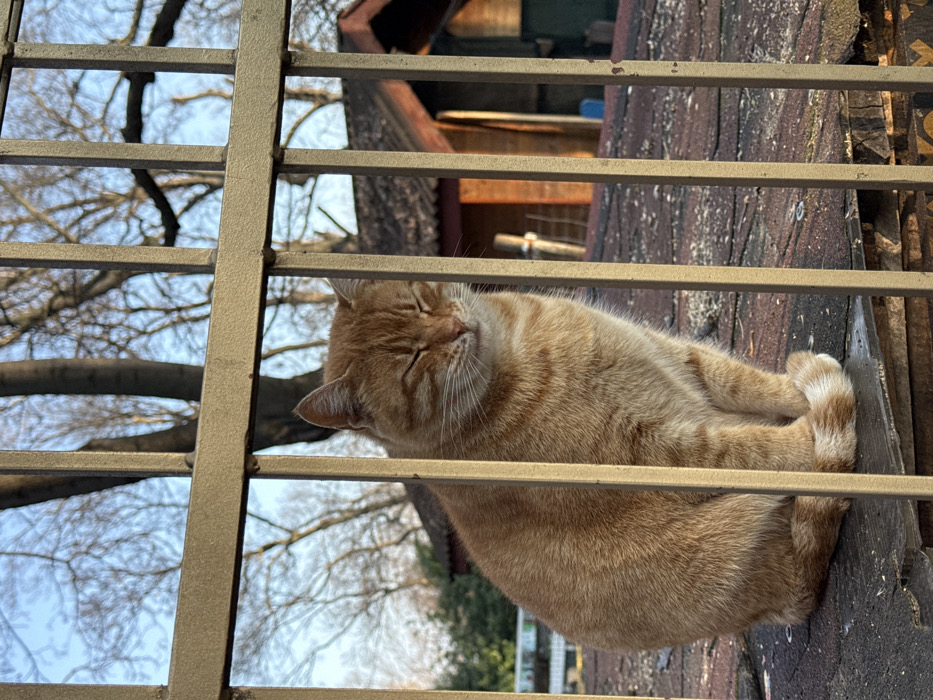 An orange domestic short-haired cat with tabby markings is depicted sitting behind a light-colored metal fence composed of vertical bars and horizontal rails. The cat is facing slightly to the viewer's right with its eyes closed, resting on a dark, weathered surface that appears to be interlocking roof tiles or planks, showing signs of debris. Its front paws are tucked beneath its chest, and its striped tail, featuring a white tip, is wrapped around them. In the background, beyond the fence and cat, bare deciduous trees stand against a light blue sky. A small building with a reddish-brown gabled roof and brown walls is visible to the right of the cat. The scene is illuminated by natural daylight. This location is in Varna, Bulgaria.