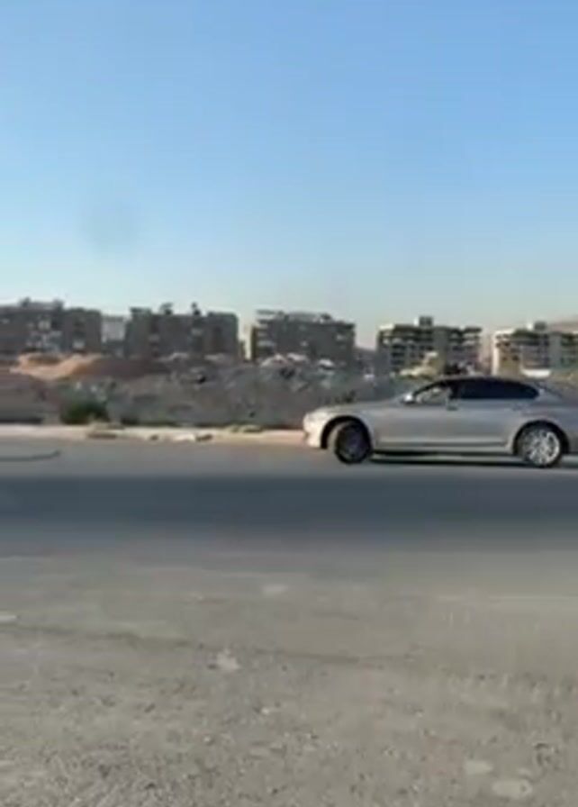 The video depicts a silver BMW sedan performing a donut stunt on an asphalt road