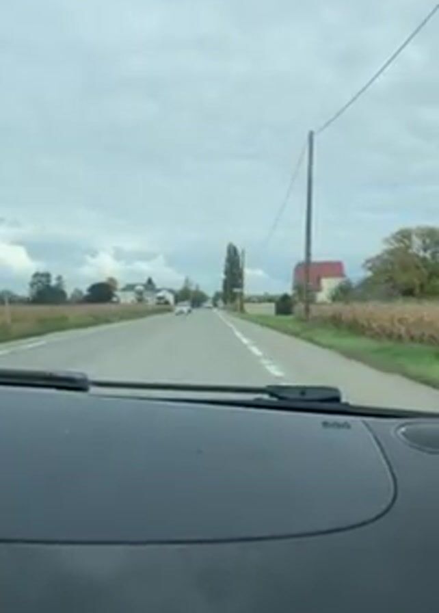 car's dashboard view while driving on a straight road. The sky is overcast, and the landscape features fields, trees, houses, and utility poles alongside the road. A few cars are visible in the distance.