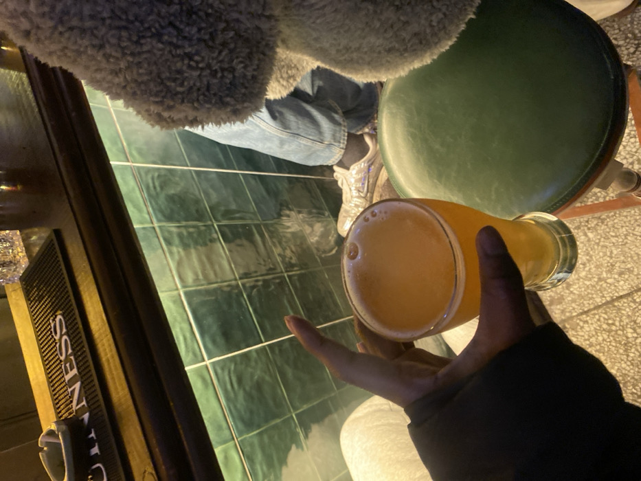 This image depicts an interior scene at an establishment in Liangjiang, China, likely a bar or pub, under dim artificial lighting. In the foreground, a dark-skinned hand, partially covered by a dark sleeve, holds a pilsner glass filled with a pale amber liquid, consistent with beer, topped with a thin layer of foam. To the right of the beer glass, a round bar stool with a dark green upholstered seat is visible. Beyond the stool, the lower legs of an individual are partially obscured by a fuzzy grey garment. This individual is wearing blue denim jeans, dark socks, and metallic silver sneakers. The background features a dark wooden bar counter with a black rubber bar mat displaying the word "GUINNESS" in white lettering. An ashtray containing what appear to be cigarette butts is positioned on the bar mat. Below the counter, a wall covered in glossy, dark green square tiles is visible, illuminated by a green ambient light source. The floor beneath the stool and hand appears to be light-colored with a textured pattern.
