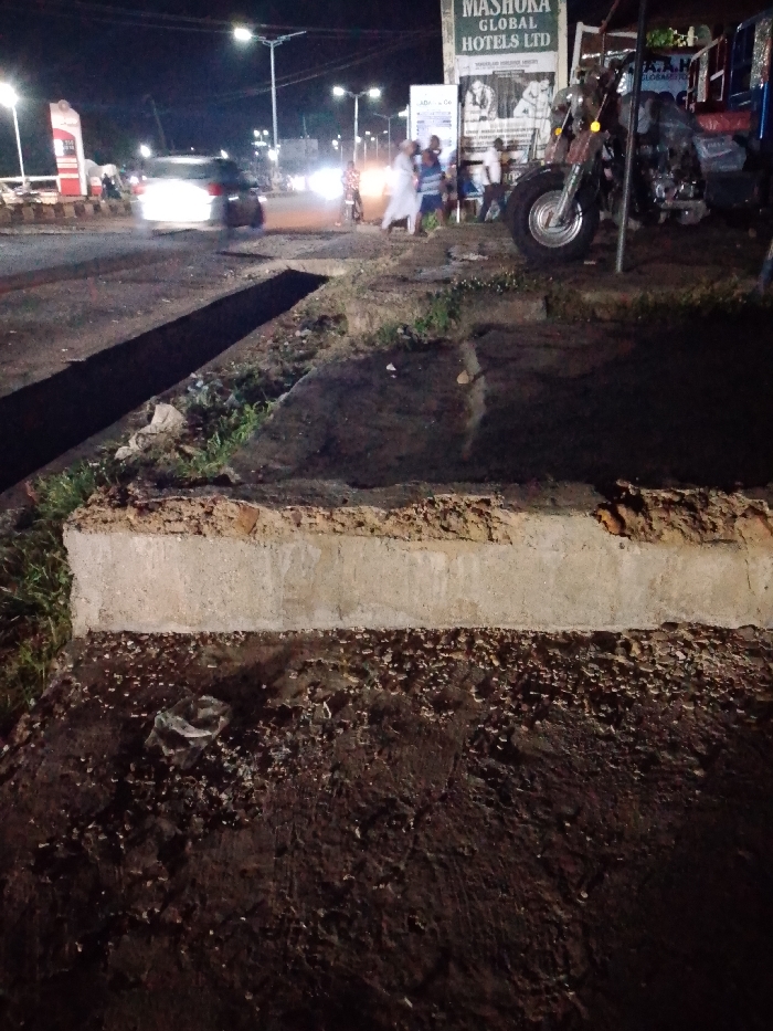 The image presents a nighttime street scene in Lokoja, Nigeria, identified by a prominent "MASHOKA GLOBAL HOTELS LTD" billboard in the mid-background. The foreground features a horizontally oriented, weathered concrete curb or retaining wall, approximately 30-40 cm high, exhibiting a lighter gray concrete base topped with exposed reddish-brown, eroded material. The ground directly in front of this structure is dark, uneven soil with scattered light-colored debris and a crumpled white plastic bag. A small patch of green grass is visible to the left of the curb. Beyond the curb, a paved road is visible, illuminated by multiple streetlights on tall poles. A white car with illuminated taillights appears blurred in motion on the road, moving from left to right. To the right of the road, on an unpaved shoulder or sidewalk, several individuals are present, standing or walking. One person in a white garment is distinctly visible. A large, dark-colored motorcycle, possibly a custom cruiser or tricycle, with a prominent front wheel and chrome accents, is parked or stationary on this shoulder. The "MASHOKA GLOBAL HOTELS LTD" billboard, brightly lit, dominates the right mid-background, with additional signs, including "A.D. & Co." and "A.A.H. Global," visible beneath it. The overall environment is an urban setting after dark, characterized by artificial light sources from streetlights and vehicle headlights/taillights. No specific interactions or actions beyond pedestrian movement are clearly discernible among the individuals.
