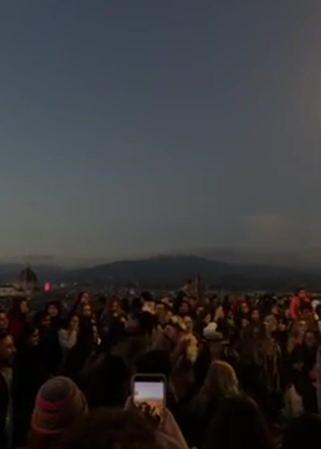A medium shot captures a large, dense crowd of people, mostly in silhouette against a twilight sky. The sky is transitioning from light to dark, with a hint of fading sunlight on the horizon. The people are oriented away from the camera, toward a cityscape with discernible landmarks, including a dome-shaped building and a tall spire. Rolling hills can be seen in the background. The scene is being recorded from within the crowd, with a person holding up a smartphone, actively taking pictures or recording a video. The overall atmosphere seems celebratory or commemorative, with the crowd possibly gathered for a special event or a scenic view.