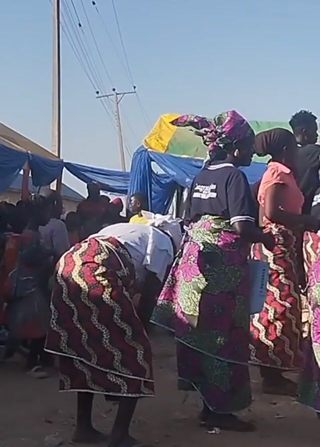 The video depicts a group of people gathered outdoors on a sunny day, possibly at a celebration or event. The central focus is on a few women, dressed in traditional African patterned skirts, dancing to music. One woman is bent over, perhaps adjusting her skirt, while others are standing or moving rhythmically. In the background, there are more people, some sitting under a blue and yellow tent or awning. Power lines are visible in the sky above the crowd. The ground appears to be dirt or gravel. The overall atmosphere suggests a lively and festive occasion.