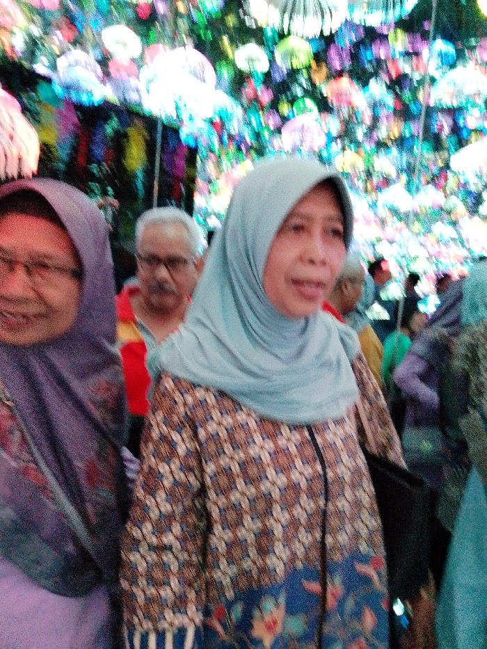 The image portrays an interior or semi-enclosed public space in Ngadirejo, Indonesia, characterized by a brightly lit, decorative ceiling. In the foreground, a middle-aged woman stands slightly right of center, gazing forward with a neutral, slightly open-mouthed expression. She is wearing a light blue hijab and a long-sleeved garment featuring a brown and tan geometric pattern transitioning to a dark blue floral design at the bottom. A dark strap from an unseen bag is visible over her left shoulder. To her immediate left, a portion of another middle-aged woman is visible, wearing a purple hijab and glasses, with a smiling expression directed towards the left side of the frame. Directly behind these two individuals, a man with gray hair, a mustache, and glasses wears a red polo shirt with a yellow stripe, looking straight ahead. The background contains multiple indistinct, blurry figures, indicating a crowded environment. The ceiling is densely covered with numerous illuminated, translucent, umbrella-shaped or jellyfish-shaped decorative lights in various colors, including white, blue, green, pink, yellow, and red, casting a colorful ambient light over the scene.