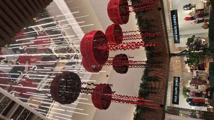- "festive display of red spherical ornaments hanging from the ceiling of a shopping mall" by FM-VH5CK2, licensed under CC BY 4.0