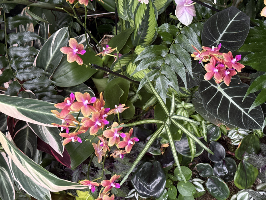 The image depicts a close-up, densely packed botanical scene within an indoor conservatory or greenhouse located in the city of London, United Kingdom. Multiple clusters of small orchids are prominently featured, their petals transitioning from orange-yellow at the outer edges to a vibrant magenta-pink in the center. The surrounding environment is rich with diverse tropical foliage. Visible plants include large, elongated leaves with cream-white variegation along central veins and margins (upper left), and broad, dark green leaves displaying distinct lighter green patterns along their veins (mid-right). A prominent star-shaped plant with slender, radiating, dark green leaves featuring a light green central stripe is positioned mid-left. In the lower sections, numerous small, round, dark green leaves, some exhibiting visible water droplets, are present alongside darker, almost black, heart-shaped leaves with stark white venation. A textured, deep green fern frond occupies the mid-right. The scene is verdant and humid, with no human figures or external man-made structures discernible, focusing solely on the botanical elements.