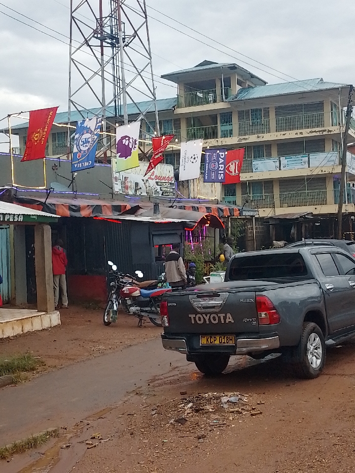 This image captures a street scene in Chevaywa ward, Kenya, under an overcast sky. In the immediate foreground on the right, the rear of a dark grey Toyota Hilux pickup truck is parked on an unpaved, reddish-brown dirt road. The truck displays Kenyan license plate KCP 018H. The ground beneath and around the truck consists of dirt, with visible puddles and scattered litter/debris. To the left of the truck, a red and blue motorcycle is parked on the same unpaved surface. Further left, a narrow concrete path abuts a single-story structure with a green awning and partial "M-PESA" signage visible. A person wearing a red jacket and light-colored pants stands with their back to the viewer near this structure. In the mid-ground, a series of low-rise, informal structures constructed of corrugated metal are present. One prominent structure, possibly a "Lounge" as suggested by a partially visible sign, features a black and orange striped awning and is adorned with string lights. Above this structure, a line of large rectangular flags is displayed, representing various football clubs and leagues, including Manchester United, Chelsea, the Premier League, Champions League, Paris Saint-Germain, and Arsenal. One person in a light brown jacket stands near this lounge structure, facing towards the right. Other indistinct figures are partially visible further in the mid-ground. In the background, a multi-story building with light-colored walls, multiple balconies, and a blue-green roof extends across the frame. The building's windows appear to have blue frames. A large, metal lattice tower, characteristic of a communication mast, is partially visible on the left side of the frame, rising above the foreground structures against the cloudy sky.