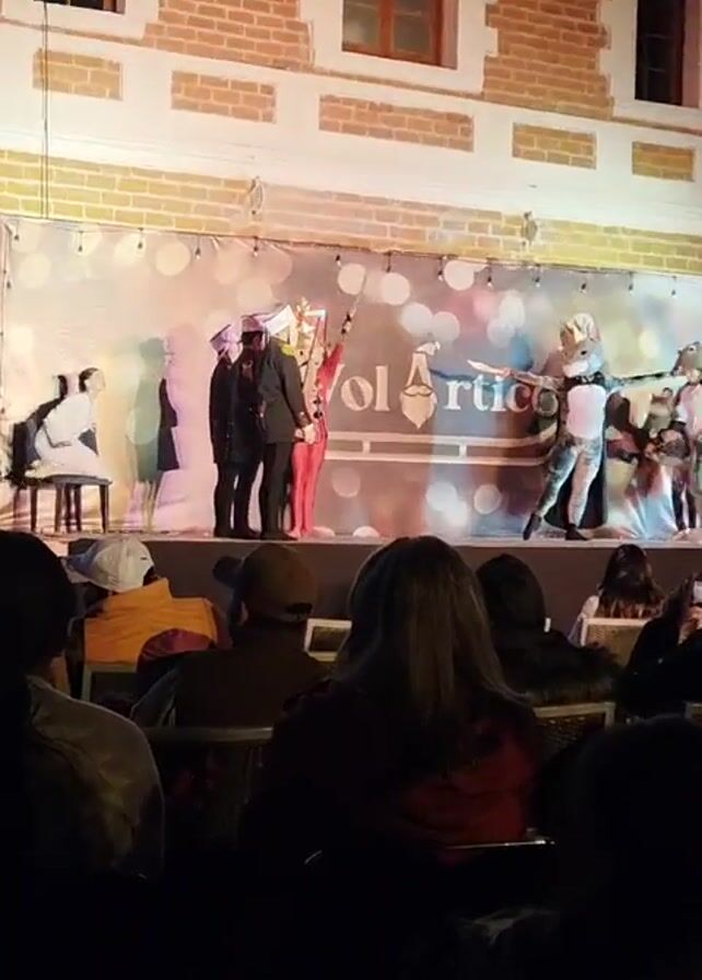 A stage performance is underway outdoors in front of a brick building with arched windows. The stage is covered with a backdrop of lights and a logo that reads "VolArtico". Actors dressed in costumes are performing, including a person in a suit, a toy soldier, and several people dressed as mice. An audience sits in chairs in the foreground, observing the performance. Some audience members are using their phones. A Christmas tree stands to the left of the stage.