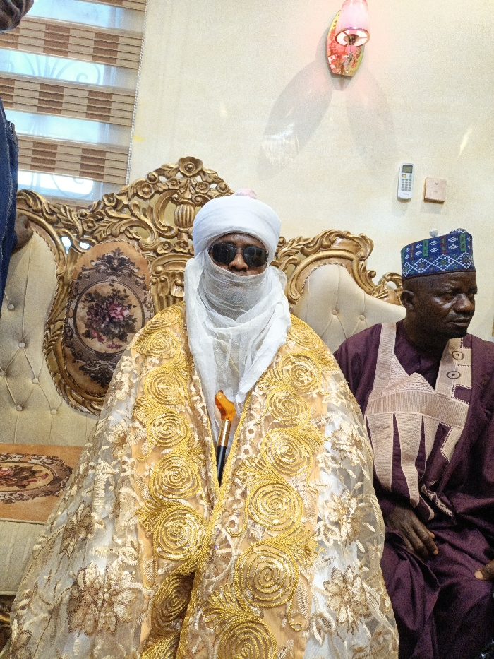 The image captures an indoor scene in Gwagwarwa, Nigeria, featuring two seated males. The central figure is dressed in elaborate traditional attire, including a white turban, dark sunglasses, and a white facial veil obscuring the lower face. A voluminous, translucent gold outer robe, intricately embroidered with golden floral and spiral patterns, drapes over a lighter garment. A dark walking stick with an amber-colored, ornate handle is visible, partially obscured by the robe. This individual is seated on a plush, ornate, gold-painted sofa with carved details and a patterned cushion featuring floral motifs. To the right, a second male is seated, wearing a blue cap with geometric patterns and a maroon-colored traditional garment featuring light-colored embroidery on the chest. His face is visible, with a neutral expression, gazing slightly to the right of the frame. The background consists of a light-colored wall, displaying a decorative reddish-pink wall sconce casting two distinct shadows, a white wall-mounted remote control, and another smaller wall-mounted object to its right. Horizontal window blinds are visible in the upper left portion of the image. Both individuals are stationary.
