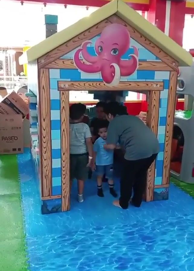woman and several young children in an indoor play area. The play area is decorated with a nautical theme, including a small, colorful house structure with an octopus design on the front. The floor is covered in blue mats that resemble water. The woman is wearing a grey shirt and black pants and appears to be helping the children as they play in and around the house. There are cardboard boxes and other play equipment visible in the background. The room has a red, yellow, and white color scheme.