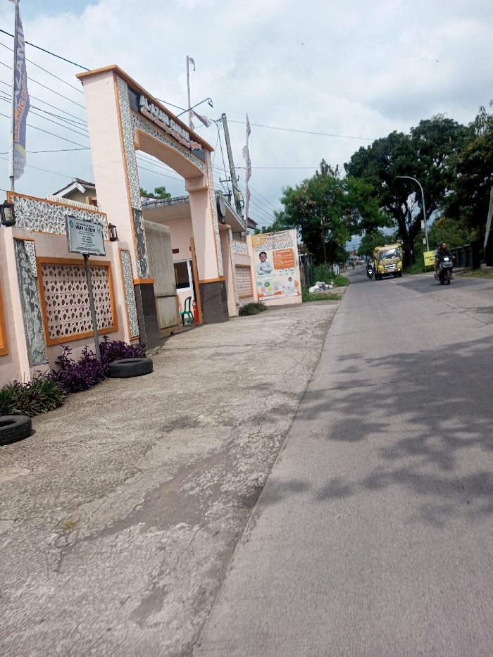 This image depicts a street scene in Khajuripada, India, under an overcast sky. On the left, a light peach-colored arched gateway, adorned with decorative white patterns and dark grey bases, functions as an entrance. Text on the arch includes "ALAZHAR," and a banner displaying "ISLAMI" hangs from a pole nearby. A blue signboard affixed to the left pillar reads "PURA TIRTA SARI" with further illegible text. Two black lanterns are mounted on the side pillars of the gateway. Purple-leafed plants grow at the base of the wall, where two black vehicle tires rest on the ground. A white-framed advertisement poster featuring a smiling boy and text is attached to the building's facade to the right of the arch. Inside the archway, a green plastic chair and a red fire extinguisher are visible. Utility wires are strung across the upper portion of the frame. Adjacent to the entrance is an asphalt road, partially covered by tree shadows. In the distance, a yellow truck travels away from the viewer. Closer to the foreground, a person on a dark motorcycle approaches on the right side of the road. Green trees line the right edge of the road, and a street light pole is visible among them. A yellow sign is partially visible on the far right. The concrete ground in front of the gateway meets the asphalt road.