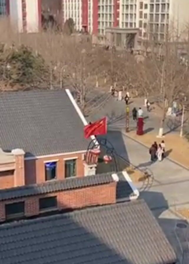 The camera looks down from a high vantage point, offering a view of a campus or public space in China. In the foreground, there are rooftops of brick buildings. A Chinese flag is prominently displayed in the middle of the frame, attached to a decorative metal structure, which is red, white and yellow. People are walking along paved paths in the space beyond the roofs. Tall modern buildings are visible in the background, some with red accents. The trees lining the walkways are bare, suggesting it is a cooler season.