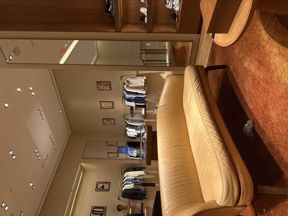 The scene depicts the interior of an upscale retail establishment located in Winchester, United States of America. The environment is brightly illuminated and currently devoid of human presence. In the foreground, a long, curved sofa upholstered in light tan leather with dark wooden legs rests on an orange-brown shag carpet. A crumpled piece of light-colored plastic or paper is visible on the carpet beneath the sofa. To the right, a section of a circular wooden coffee table is visible, supporting a rectangular wooden box. The midground features light beige walls adorned with multiple framed abstract artworks. Two wall-mounted metal racks display folded and hanging garments, including shirts and light jackets, primarily in white, grey, blue, and black tones. A central glass-topped display case on a wooden pedestal is present. A large, full-length mirror on the right wall reflects an adjacent hallway or stairwell with wooden railings and a partial red "EXIT" sign overhead. To the far right, a tall wooden shelving unit contains multiple pairs of shoes, including dark loafers and various sneakers, displayed on its tiers. The light-colored ceiling is equipped with numerous recessed circular spotlights that provide uniform illumination to the space.
