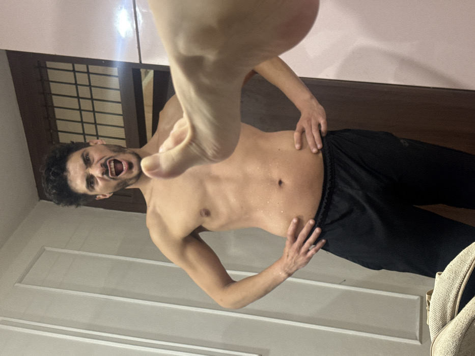 The image depicts a male individual and a disembodied foot in an indoor setting, presumed to be a room within the city of Delhi, India. The primary subject is a shirtless male with dark, curly hair and a beard, captured from the waist up. He stands with his hands on his hips, exhibiting a forceful expression with his mouth wide open, teeth bared, and eyebrows furrowed. Small droplets of sweat are visible on his torso. Obscuring the lower right portion of the man's face and chest, a light-skinned bare foot is prominently positioned in the foreground, extending from the right side towards the center, with its sole facing the viewer and toes slightly curled. The background features a light-colored wall with decorative vertical moldings on the left and a dark wooden door or cabinet with a rectangular grid design on the right. A light-colored fabric object, possibly a bag, is partially visible in the lower-left corner of the frame.