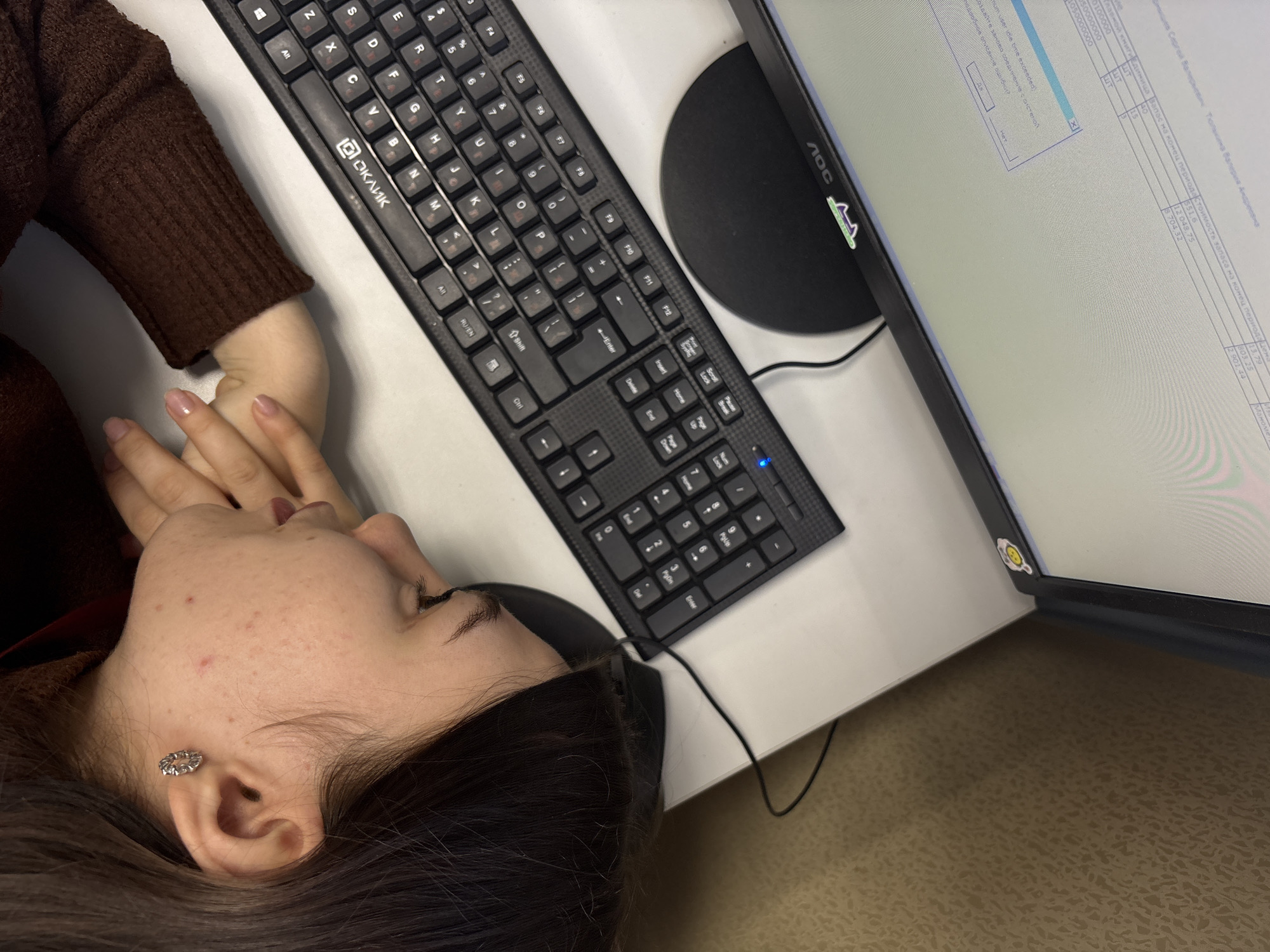 young woman lying on a desk. Her head rests on the surface near a black keyboard, and her hands are positioned close to her face. She is wearing a brown sweater and has an earring in her left ear. The keyboard is a black Оклик brand keyboard with Cyrillic characters. A black computer monitor, an AOC brand, is to the right of the keyboard, displaying a window with Russian text and numbers. The desktop surface is white. The setting could possibly be an office desk in Perm, Russia given the Cyrillic text.