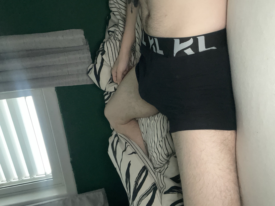 A person is depicted lying on a bed in an indoor setting, presumed to be a bedroom within Rishon LeZion, Israel. The individual is positioned horizontally, with their torso and legs visible from approximately the mid-thigh upwards. They are wearing black boxer briefs with white lettering, partially visible as "RL" on the waistband. One leg is slightly bent, with the knee raised. The person's left arm is bent at the elbow, resting on or near the bedding, and a dark tattoo is partially visible on the upper arm or shoulder. The skin is fair-toned and lightly hirsute on the visible areas of the legs and torso. The bed is covered with white bedding featuring a black abstract pattern, including stripes and zig-zags. A dark green wall is visible behind the bed, extending upwards to a window fitted with white horizontal Venetian blinds that are partially open, allowing bright daylight to enter. Light grey curtains are drawn to the sides of the window frame. The floor or lower part of the room is not visible, with the bed occupying the foreground.