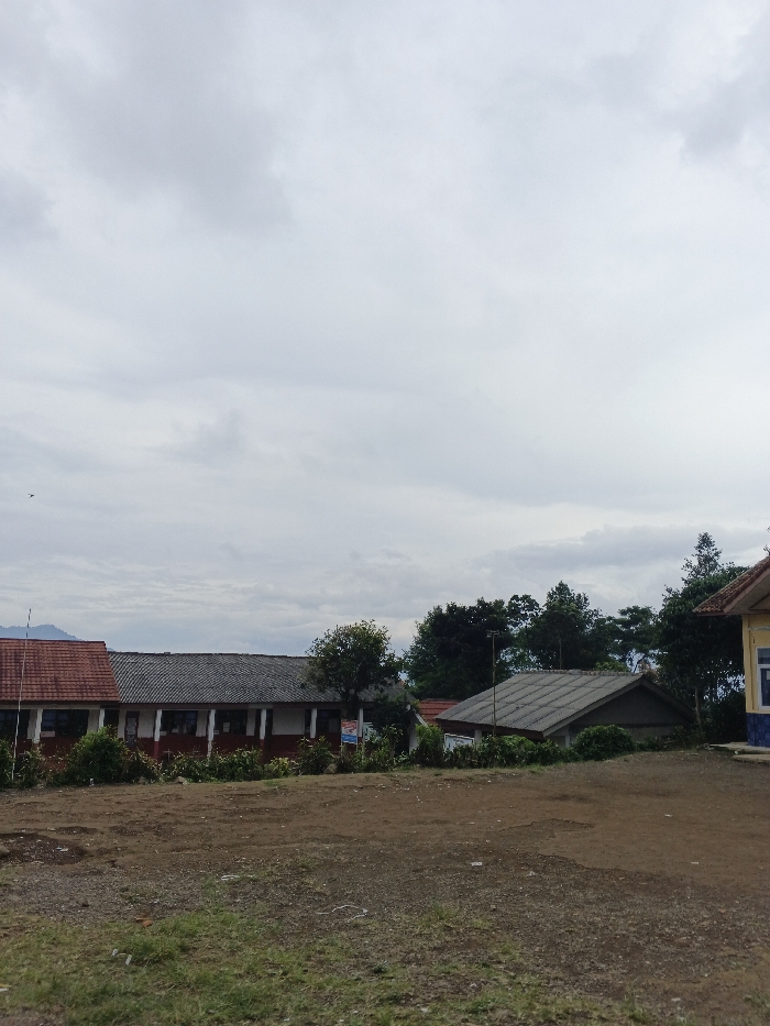 The image depicts an outdoor scene in São Félix do Xingu, Brazil, under a heavily overcast sky composed of light gray clouds. A small, dark bird is visible in flight in the upper left quadrant. The foreground features an expansive, uneven ground composed primarily of packed dirt and sparse, dry grass with scattered small debris. In the midground, a series of structures are visible. To the left, a long, single-story building with a red-tiled roof section on the far left transitions to a dark gray roof, featuring a white facade with red trim and multiple rectangular windows. Further right, partially obscured by dense green foliage, is another single-story building with a dark gray, sloped roof. A portion of a third building, characterized by a light yellow wall, a blue base, and a red-tiled roof, is visible on the far right. Lush green trees and shrubs are interspersed among and behind the structures. Distant, hazy mountains or hills are visible on the horizon line in the background to the left. No individuals, actions, or interactions are observed within the scene.