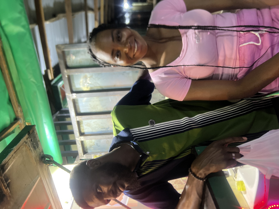A smiling woman with braided hair and a pink outfit stands alongside a man in a green and black striped shirt. The couple is indoors, potentially in a food stall. The background features stacked glass or acrylic containers, possibly for food storage. Green tarp or plastic is visible in the upper left, and artificial lighting illuminates the scene.