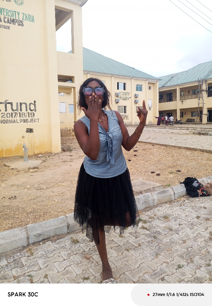 The image depicts an outdoor scene within a university campus in Akwanga, Nigeria. The foreground is dominated by a dark-skinned woman standing on grey interlocking paver stones, slightly left of the image center. She is wearing a light blue sleeveless top with a tied bow at the chest, a black layered mesh skirt, and silver sandals. Her face is partially obscured by large, dark-framed sunglasses and her right hand, which covers her mouth. Her left hand is raised with the index finger pointed upwards. She is adorned with multiple necklaces and a bracelet on her left wrist. To her immediate left, a light yellow two-story building displays black painted text that reads: "UNIVERSITY ZARIA", "L CAMPUS", "STATE", and below that, "TETFUND 2017/18/19 NORMAL PROJECT". In front of this building, a metal fixture rises from a concrete base within an area of dry, light brown soil adjacent to the pavers. To the woman's right, a black backpack and other items are situated on the ground near the edge of the paved area. The background features several light yellow multi-story buildings with teal-colored roofs. One section of a building shows visible scaffolding. In the distance, several individuals are gathered near these buildings, one person in a purple garment, and a motorcycle is also visible. The sky overhead is overcast.