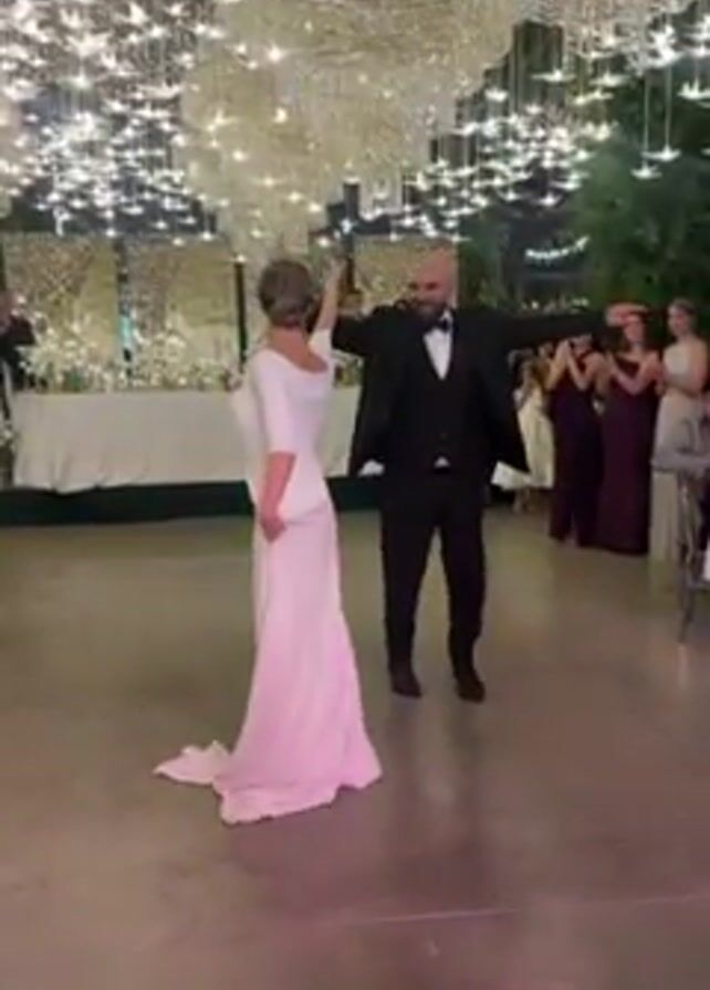 A wedding dance scene features a bride and groom under elaborate chandelier-like lighting. The bride wears a white, floor-length dress with three-quarter sleeves and has her hair up. The groom is in a black tuxedo with a bow tie and a neatly trimmed beard. They perform a dance move with their arms outstretched, palms facing up. Behind them, guests are seen clapping and watching. The room is decorated with a long white table, greenery, and mirrored accents. The dance floor is a light, polished surface. The atmosphere is celebratory.