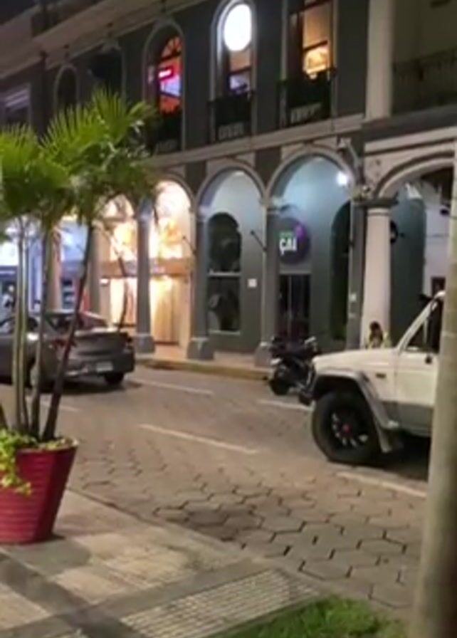 The video depicts a night scene of a street lined with buildings featuring arched facades and businesses, including one with "Açaí" signage. Cars and a motorcycle are parked along the street. There is a full moon visible in the sky. Palm trees in pots add to the ambiance. People are visible but not the main focus.