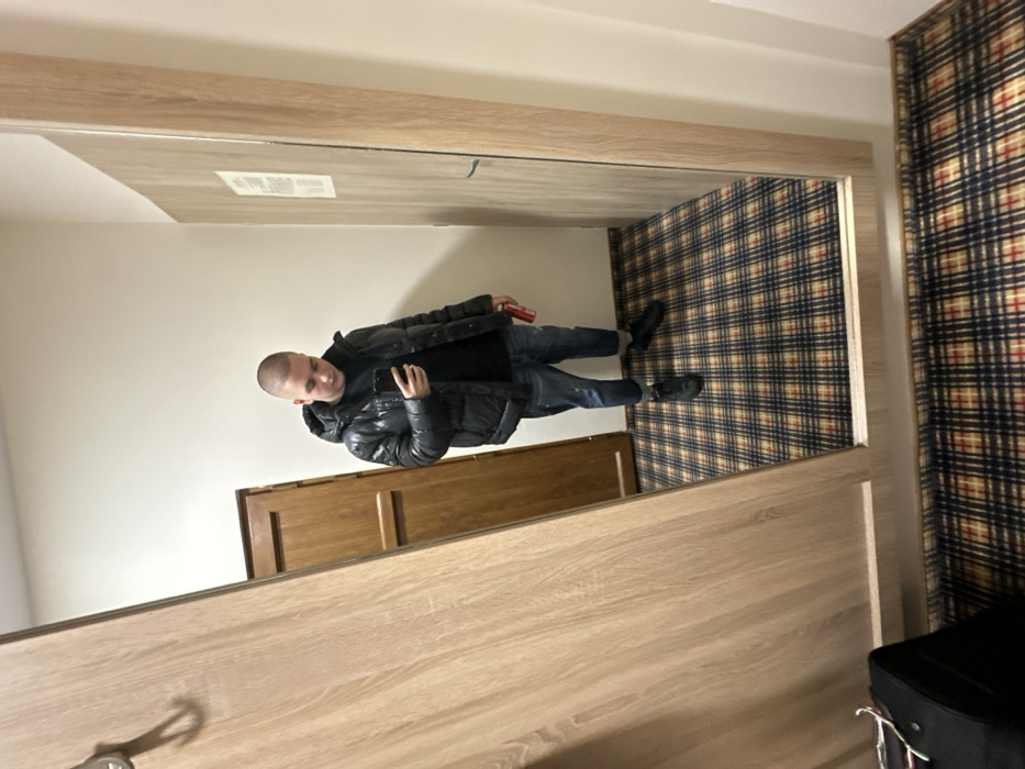 An interior scene in Radievo, Bulgaria, shows a male subject capturing his reflection in a full-length mirror. The man, with a closely shaven head, is dressed in a black glossy puffer jacket, a black shirt, blue distressed jeans cuffed at the ankles, and black sneakers. He holds a black smartphone in his right hand, angled towards the mirror, and a red beverage can in his left hand. The reflected background features light-colored walls, a dark brown paneled wooden door to the subject's left, and a lighter wooden door frame to his right. The floor is covered with a distinct plaid carpet, patterned in shades of red, blue, and cream. A black rolling suitcase is partially visible on the carpet in the lower-left foreground, outside the mirror's frame.