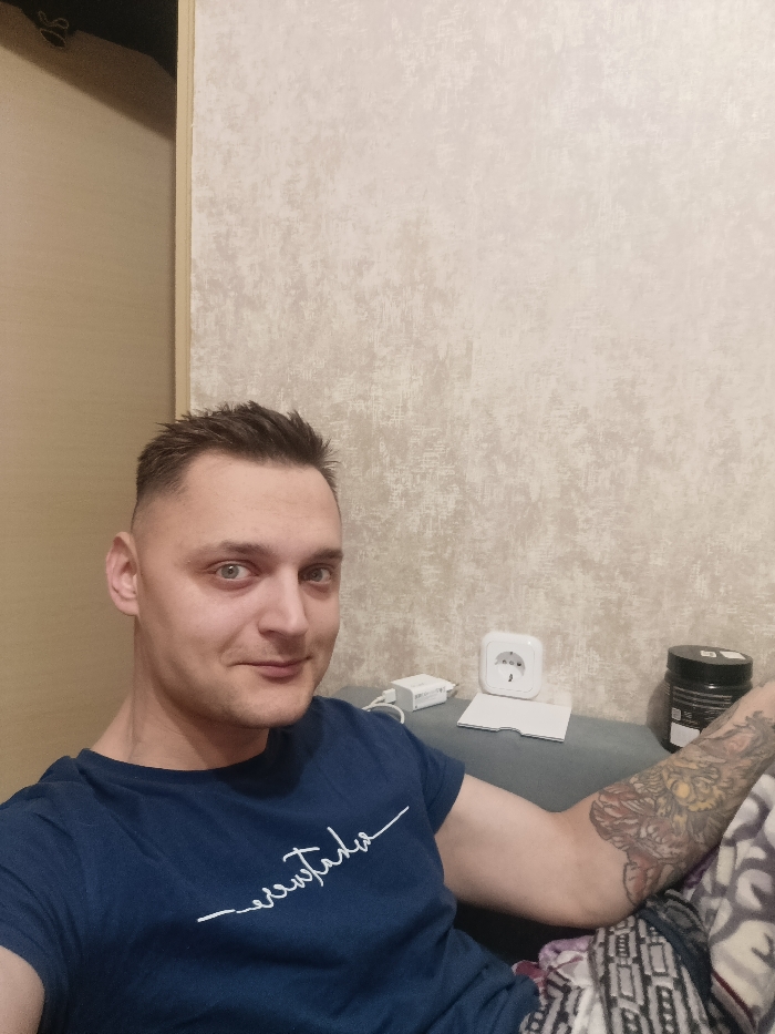 A fair-skinned man with short, dark hair smiles slightly. He wears a dark blue t-shirt with white writing. His left arm, adorned with a colorful tattoo, rests on a grey surface. Behind him, a textured, light-colored wall stretches upwards, next to a beige-toned wall. On the grey surface are a white adapter, a white European power socket, a small notepad, and a black cylindrical container. The lower right corner includes a patterned fabric.