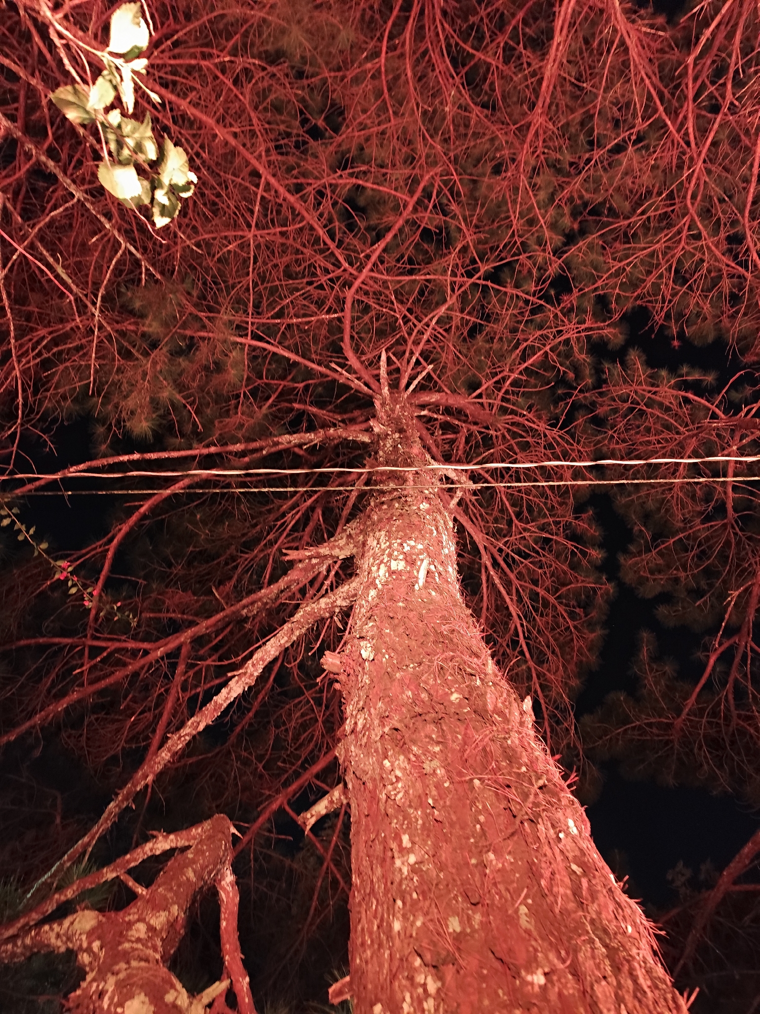 This image presents a nocturnal, low-angle perspective looking upwards into the canopy of a large pine tree in Dalat, Vietnam. The scene is dominated by a pervasive reddish artificial illumination that bathes the tree's prominent trunk and extensive network of branches. The rough-textured trunk of the pine tree occupies the right side of the frame, extending upwards. Numerous bare branches, appearing stark red due to the lighting, crisscross against a dark, unlit night sky, interspersed with clusters of dark green pine needles. In the upper left quadrant, a cluster of broad green leaves is visible, distinctly illuminated by a separate, brighter, possibly white light source, contrasting with the red environment. Two thin, horizontal utility wires stretch across the mid-section of the image, passing through the tree's branches. No individuals, animals, or direct interactions are present. The environment is clearly nighttime, characterized by specific artificial lighting.