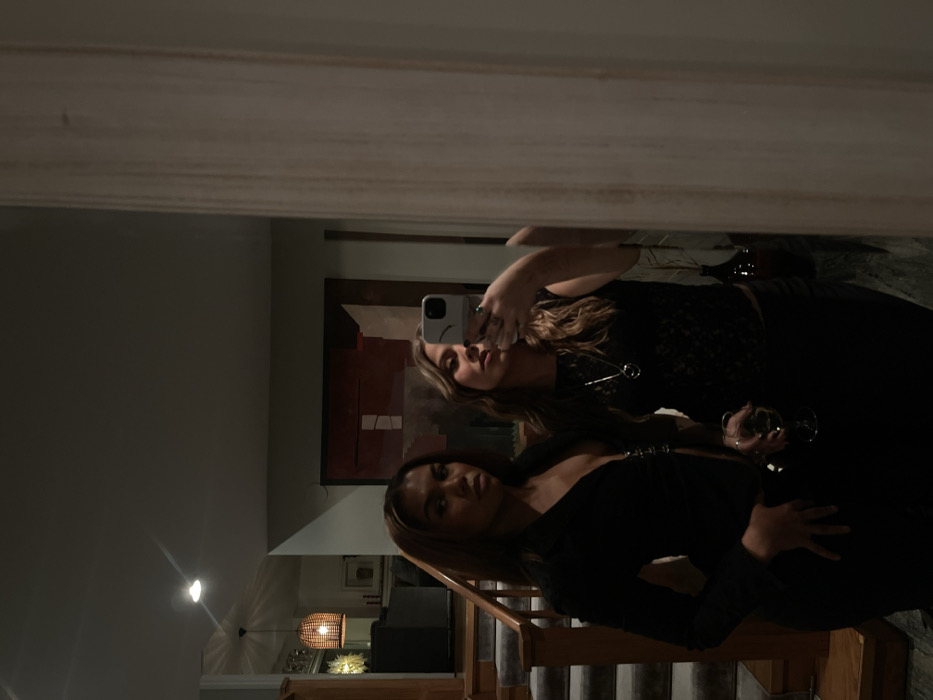 Two women pose in a mirror selfie. The woman in the foreground wears a low-cut black top with embellishments. Behind her, another woman holds a phone, obscuring part of her face. She is wearing a patterned top and a necklace. Both are holding wine glasses. A staircase is visible in the reflection, along with a decorative lamp and a painting hanging on the wall behind them.