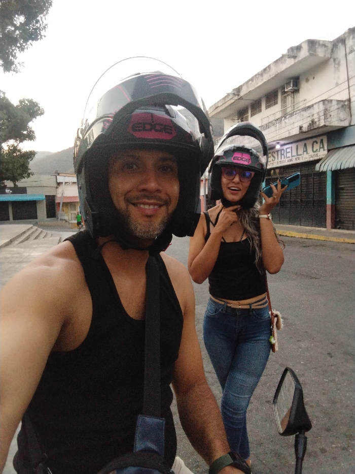 This image captures two individuals, an adult male and an adult female, in a street scene in Las Tejerías, Venezuela. The male, positioned in the foreground, is wearing a black sleeveless tank top and a black and pink "EDGE" brand motorcycle helmet with the visor raised. He has a beard and stubble, and is smiling directly at the camera, apparently taking a selfie. A dark shoulder bag strap crosses his chest, and a dark wristband is visible on his right wrist. To his right and slightly behind him stands an adult female, also wearing a black and pink "EDGE" motorcycle helmet with the visor raised and pink-tinted sunglasses. She wears a black sleeveless crop top, blue jeans with a light brown double-strap belt, and a small, light-colored shoulder bag on her right side. She holds a blue smartphone to her left ear/helmet and her right hand touches her helmet strap, while smiling towards the camera. A motorcycle mirror is visible in the lower right corner of the frame. The background on the right features a two-story, light-colored building with multiple windows, two visible air conditioning units on the upper floor, and a metal roller shutter covering a storefront on the ground level. Text above the shutter reads "ESTRELLA CA." On the left side of the background, other buildings and trees are visible, with distant mountains or hills under a bright, overcast sky. The ground beneath the subjects is a grey, paved surface.