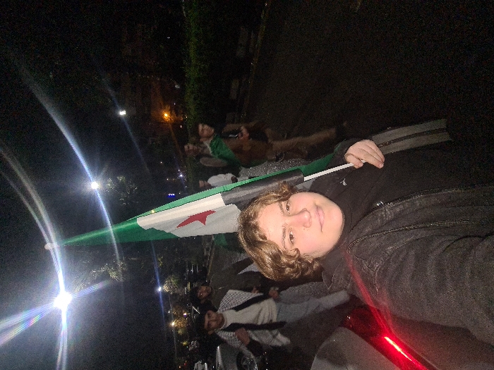 At night, a fair-skinned person lies on a red surface, holding a flag with green, white, and black stripes and a red star and crescent. The person wears a black jacket and has light brown hair. Behind them, several people gather; one wears a keffiyeh. Streetlights illuminate the scene, creating strong flares in the photograph. Vegetation is visible along the top of the frame.
