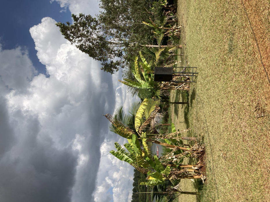 This image depicts an outdoor scene in Murera ward, Kenya, characterized by a mix of natural vegetation and a water body under a partially cloudy sky. In the foreground and midground, a mown grassy area dominates the lower half of the frame. Several banana plants and what appear to be young palm trees are scattered across this green space. Many of the banana plants exhibit large, vibrant green leaves, some with yellowing or browning edges indicative of age or environmental stress. Several banana bunches, appearing green and unripe, are visible on some of the plants. Towards the right midground, a black, rectangular speaker is positioned on a black metal stand. A dark cable, possibly for power or audio, runs from the base of the speaker towards the bottom right of the frame, partially obscured by the grass. In the background, a significant body of water, likely a river or lake, stretches horizontally across the frame. Its surface reflects the sky, appearing dark blue to grey. On the water, a small red and white boat, resembling a canoe or kayak, is visible. The far bank of the water body is lined with dense green foliage and trees. The sky above features a dramatic combination of dark grey, heavy storm clouds on the left, transitioning to brighter white cumulus clouds on the right, with patches of clear blue sky visible between them. Tall, leafy trees, some with lighter green foliage and others darker, rise along the right side and far background of the scene, silhouetted against the sky. No individuals are directly visible in the immediate foreground or midground.