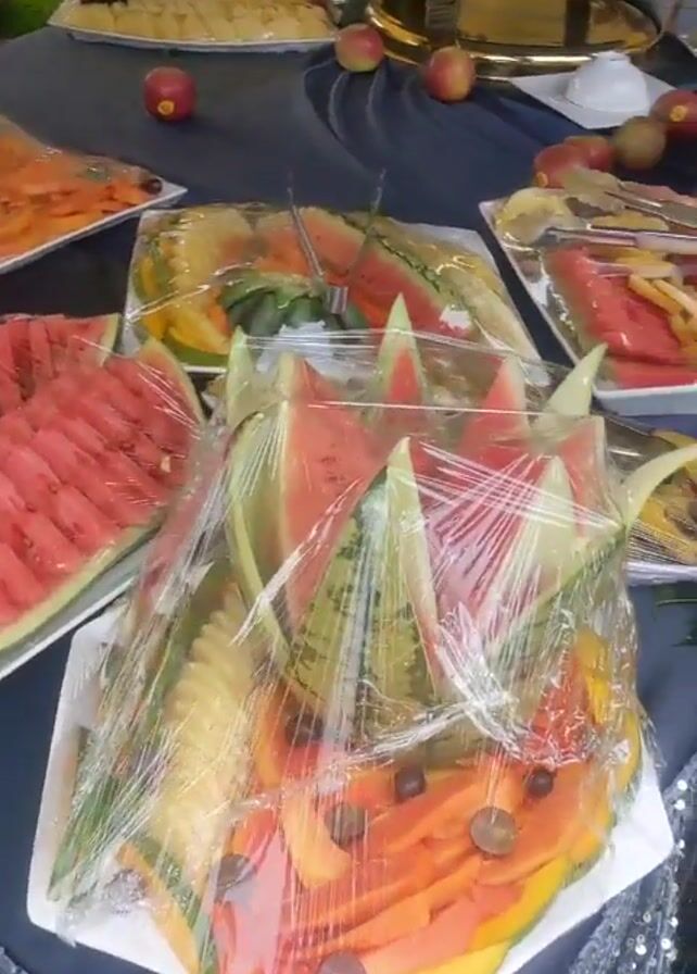 The camera captures a close-up view of a fruit platter arrangement at an outdoor event