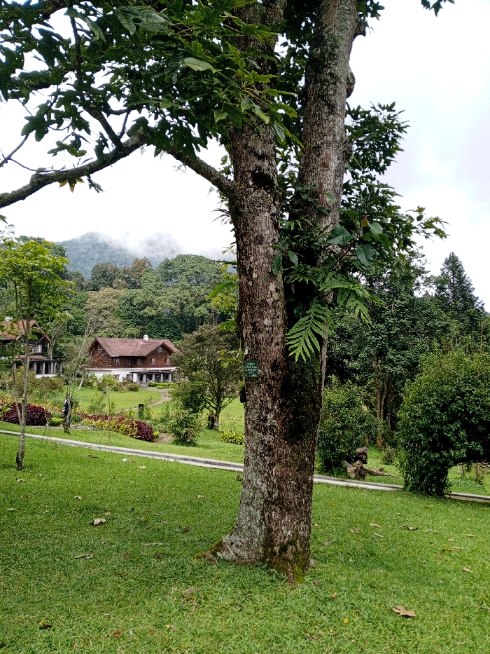 The image captures an outdoor landscape, identified as likely being at Bà Nà Hills, west of Đà Nẵng, Vietnam. The scene is dominated by a large tree in the foreground, positioned slightly right of center, featuring two main trunks with textured, moss-covered bark. Green leaves and ferns are visible growing on the tree trunks and branches. A small, rectangular green sign is attached to the left side of the main tree trunk. The ground is covered with well-maintained green grass, with a few scattered brown leaves. A light-colored, paved pathway or road segment traverses the mid-ground, curving gently from left to right. Beyond the pathway, a landscaped garden area features beds of colorful plants, including crimson and purple foliage. Two multi-story buildings are visible in the mid-ground. The central and most prominent building features a dark brown gabled roof, white upper walls, and a lighter-colored lower facade with arched openings or columns, characteristic of European colonial architecture. A second, similar building is partially visible to the left of the main structure. A small, dark human figure is discernable on the grass to the left of the central building. Another dark, ambiguous shape, potentially a second human figure, stands near the pathway on the far left. A gnarled wooden object or stump rests on the grass to the right of the pathway. The background consists of a dense treeline, transitioning to misty, cloud-obscured mountains under an overcast sky. The overall lighting is soft and diffused.