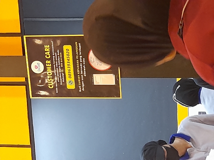 The image is of a customer service sign in a storefront in Nganjuk, Indonesia (latitude: -7.607, longitude: 111.904). The sign is black with white text and a green WhatsApp icon. It displays the phrase "Customer Care" along with instructions for customers with complaints or concerns. An individual, whose face is not visible, is standing in front of the sign. They are wearing a red shirt. Behind them, an individual with a black cap is wearing a gray polo shirt and a black face mask. A third person in the distance is partially visible and wearing a black hijab. The environment is an indoor space, with a blue wall and yellow trim. The top of a yellow ceiling tile is visible. The sign is attached to a vertical surface, and it is visible on the left and right sides of the image. The image is taken from the front, looking straight at the sign.