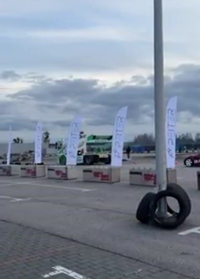 paved outdoor course with several flags lined up along the edge, each bearing the name "PETER." Behind the flags are concrete barriers topped with orange cones. A green and white racing truck is visible beyond the barriers, with a person walking near it. To the right of the flags, a stack of tires is present, and a red car is parked further down the course. The sky above is overcast with a mix of grey and white clouds. The camera is static, providing a fixed perspective of the scene.