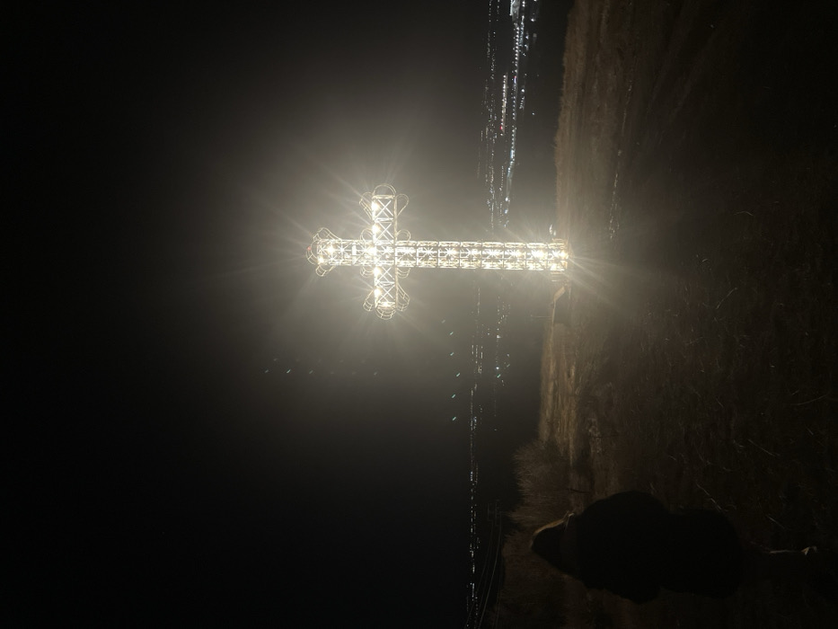 An outdoor night scene is depicted on an elevated terrain overlooking the city of Novi Han, Bulgaria. A large, brightly illuminated Christian cross stands prominently in the mid-right of the frame. The cross is constructed from a visible framework adorned with numerous lights that emit a strong, radiant glow, causing significant lens flare. In the lower-left foreground, a single individual is observed from behind, characterized by dark clothing and long hair, walking across dark, uneven ground towards the illuminated cross. The distant background reveals the scattered lights of an urban area, indicative of a city below the vantage point. The sky overhead is dark and featureless.