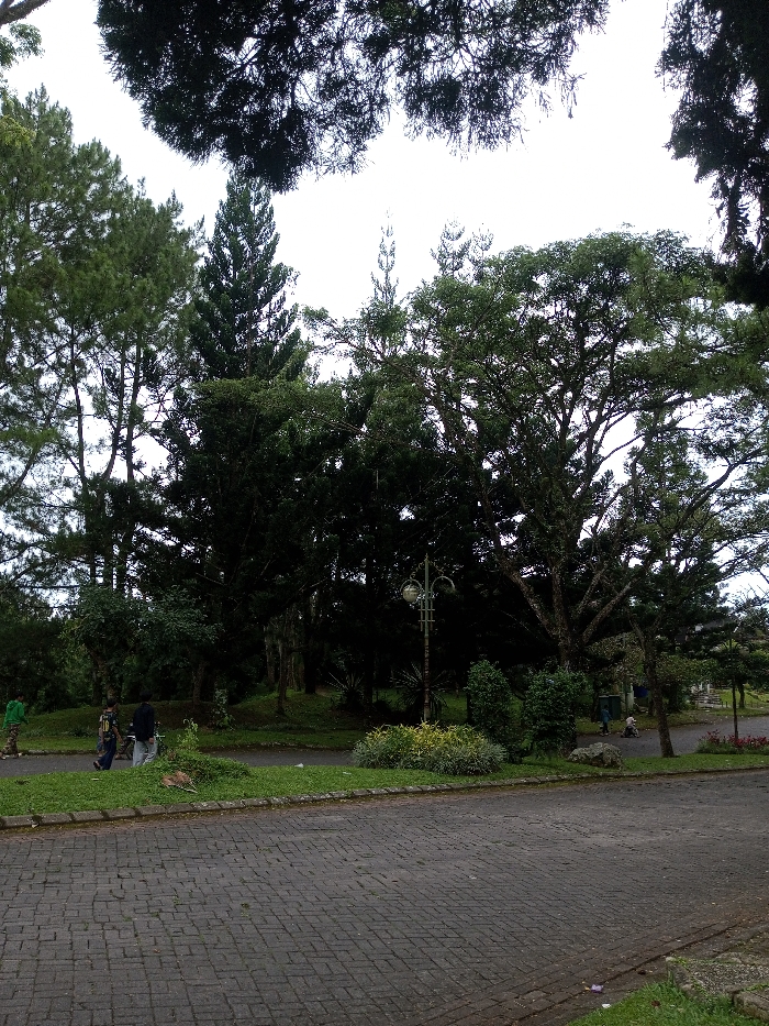 A park scene with tall trees framing the sky. A brick-paved road stretches into the distance. People are walking along a grassy area next to the road. A decorative lamp post stands among the trees. The overall lighting suggests a cloudy day.