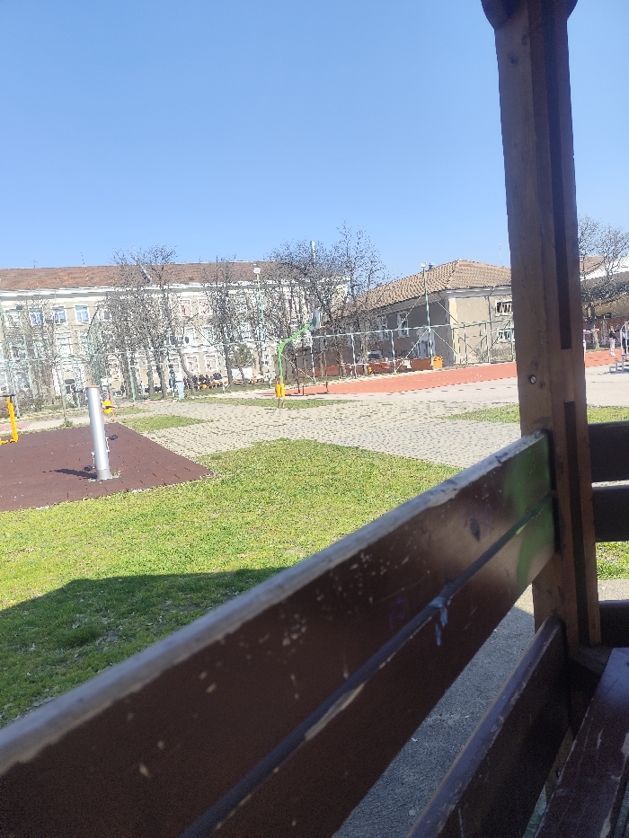 The image presents an outdoor scene in Dimitrovgrad, Bulgaria, on a clear, sunny day, likely in late winter or early spring due to the bare deciduous trees. The perspective is from behind a dark brown, weathered wooden structure, possibly a bench or part of a shelter, occupying the lower foreground. This structure shows visible wear, scratches, and faint blue/purple paint marks on its horizontal slats, secured by metal fasteners to a vertical post on the right. Immediately beyond the wooden structure, a patch of vibrant green grass is visible, partially shaded by the foreground object. To the left of the grass, a reddish-brown rubberized surface contains a silver cylindrical metal post, suggestive of outdoor fitness equipment. A light grey paved area with a patterned surface separates the grass and fitness equipment from a sports court in the midground. The midground features a red-surfaced sports court, partially enclosed by a chain-link fence. Elements of yellow outdoor fitness equipment and a green basketball hoop support structure are situated near the court. In the background, under a cloudless pale blue sky, stand several buildings. A large, multi-story building with a light-colored facade, numerous windows, and a reddish-brown tiled roof dominates the left side. To its right, another smaller building with a lighter-colored facade and a light brown tiled roof is visible. The bare trees are interspersed between the sports court and the buildings. No individuals are present in the scene.