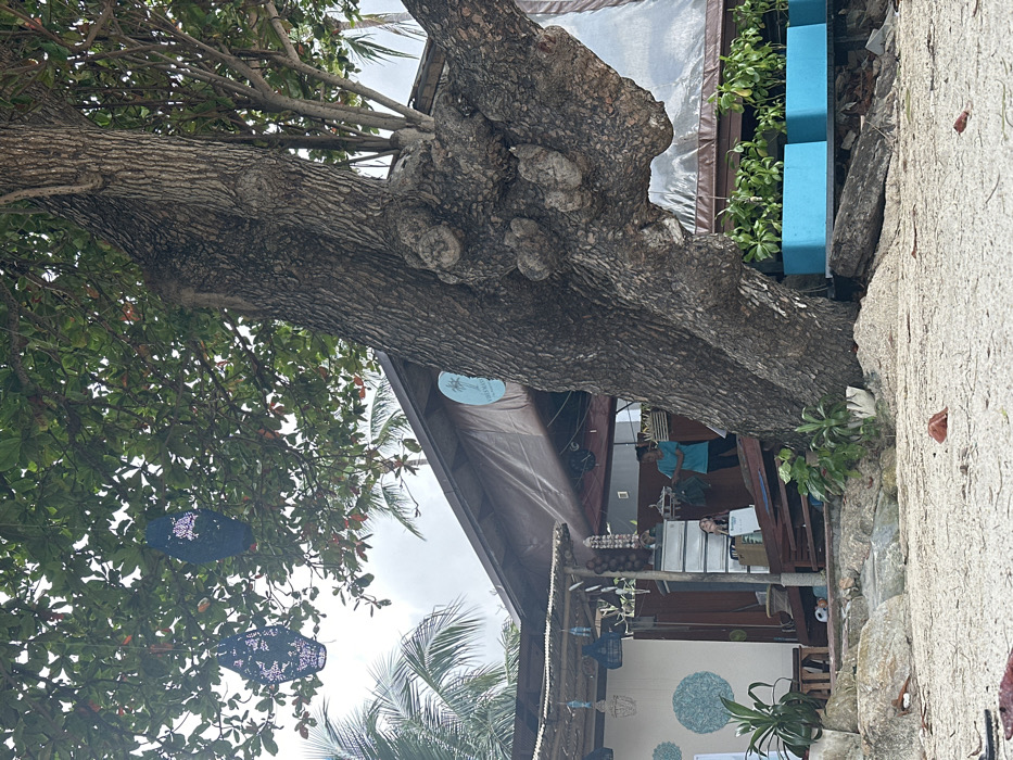 A large, gnarled tree branch dominates the frame, its rough bark textured and knotted. Lush green foliage surrounds the branch. Below, a building with a partially visible roof and open-air structure houses tables and what appear to be spa services. Decorative blue accents, palm trees, and other tropical plants are visible. The image is taken from a low angle, looking up towards the tree and building.