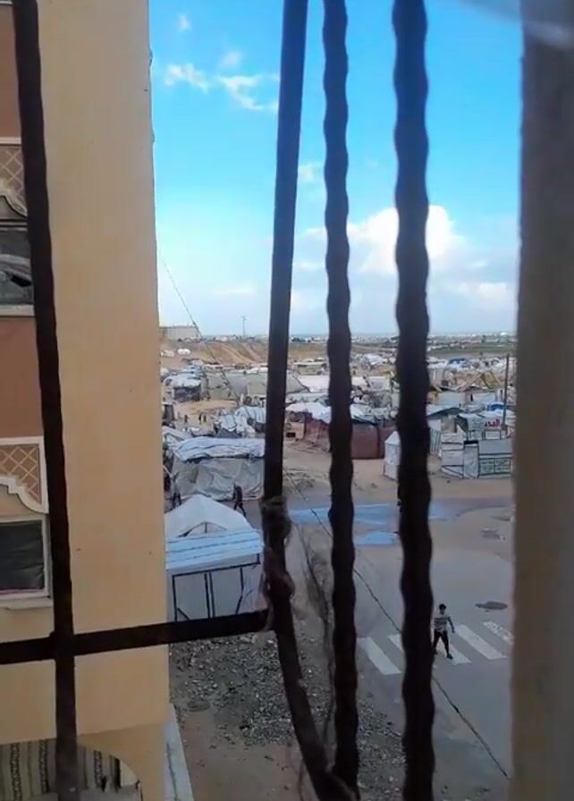 view of a refugee camp through a barred window of a multi-story building. The sky is blue with scattered clouds. In the background, numerous white tents and temporary structures are visible, forming a sprawling camp. People can be seen walking among the tents. In the foreground, a street with crosswalk markings is visible, and a child runs across it. The building's exterior is beige, and the window bars are dark and appear weathered. The overall setting suggests a place of displacement and limited resources.