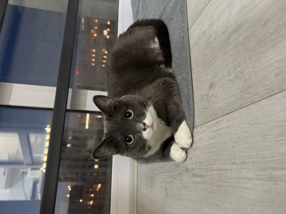 - "A dark grey domestic short-haired cat with prominent white markings on its muzzle, chest, and front paws is depicted resting on a light grey textured mat" by FM-OgmdM2, licensed under CC BY 4.0