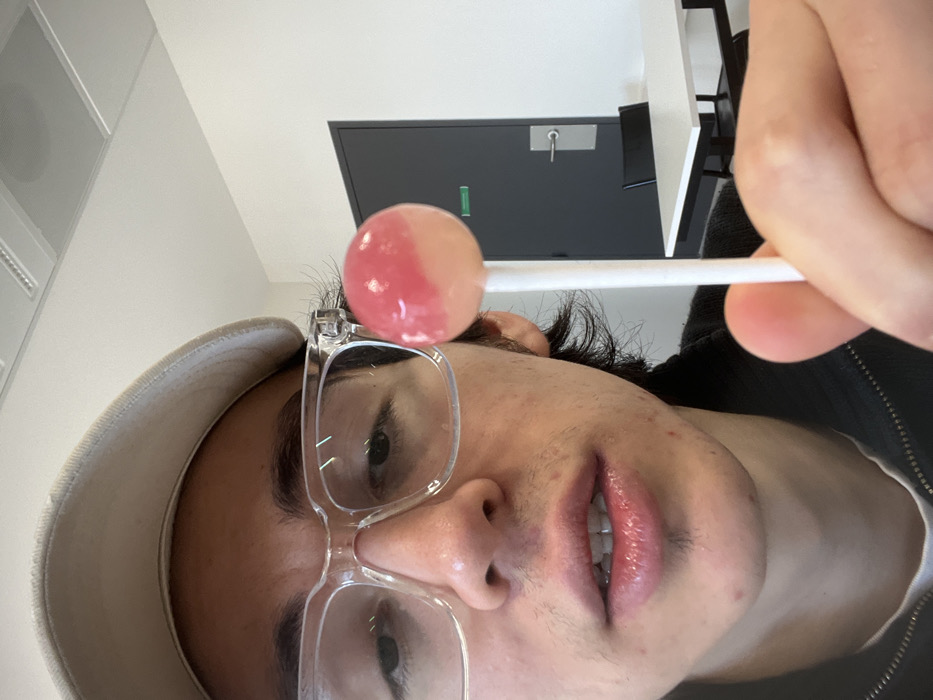 The image displays a close-up, eye-level perspective of a young male subject situated indoors in Roubaix, France. The subject, appearing in his late teens or early twenties, wears a light-colored baseball cap and clear, thick-framed eyeglasses. His dark hair is visible, and he exhibits nascent facial hair on his upper lip and chin, with minor dermal blemishes on his lower jaw. His lips are slightly parted, revealing a portion of his upper teeth. He is holding a spherical, dual-toned lollipop—pink on the upper hemisphere and a lighter peach-pink on the lower—affixed to a white plastic stick. The lollipop is held between the thumb and forefinger of his right hand, positioned to the right of his face. The background reveals a minimalist indoor environment. The walls are white, as is the ceiling, which features recessed rectangular fluorescent light fixtures. In the mid-ground, to the subject's right, a dark grey door with a silver-colored handle is visible, accompanied by a small green rectangular sign positioned at waist height. A segment of a white rectangular table with a dark base and a dark-colored chair is also visible on the right side of the frame, indicating a common area or office setting.