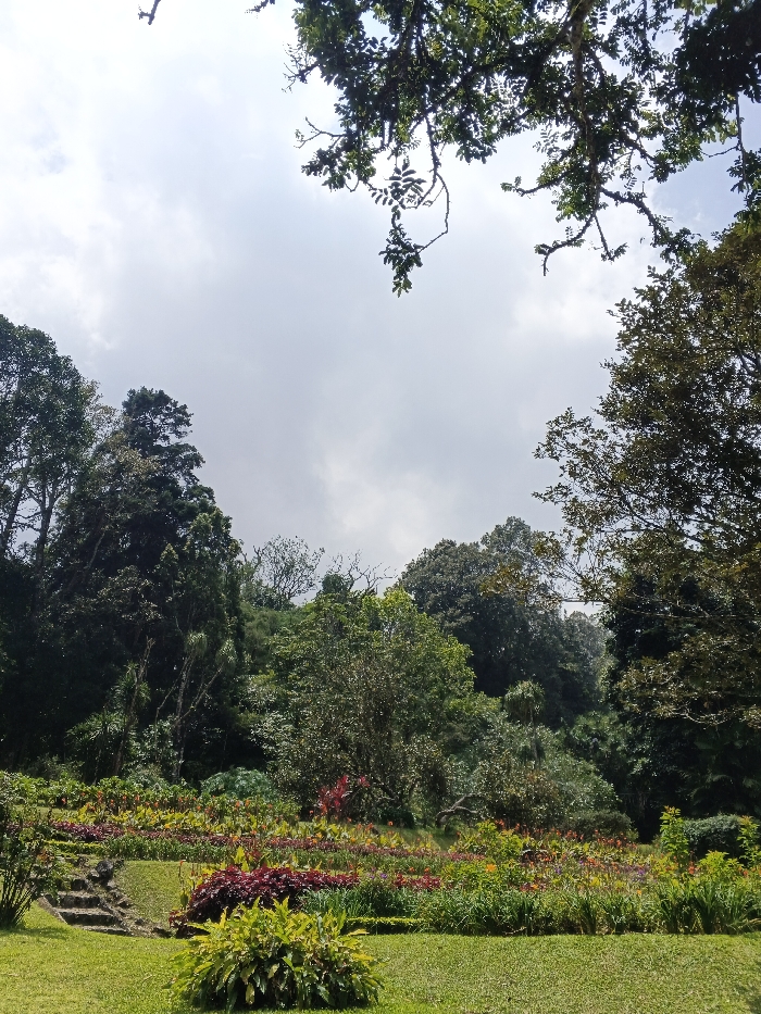 A verdant scene features a tiered garden bursting with colorful blooms. Steps ascend amidst lush greenery. Towering trees frame the view, their leaves partially obscuring a cloudy sky above. The foliage appears dense and varied, creating a rich, natural tapestry. The overall impression is one of tranquility and natural beauty.