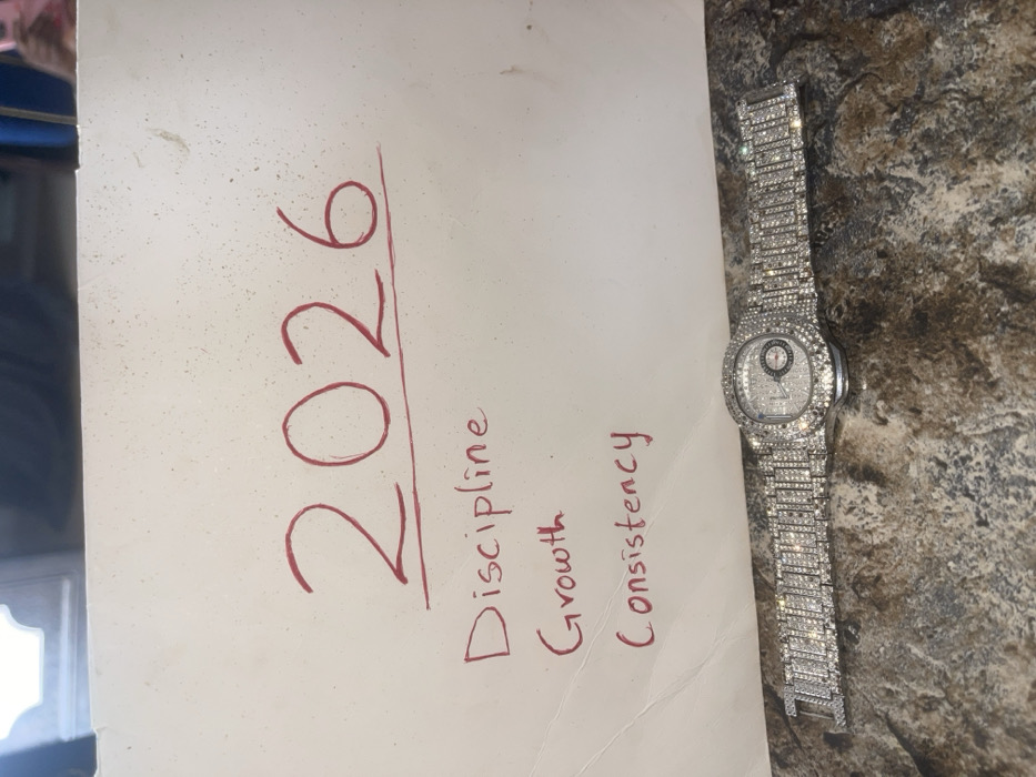 The scene is situated in the city of Alor, Nigeria. A rectangular sheet of white paper, exhibiting slight creases, occupies the upper two-thirds of the frame. Handwritten in red marker on the paper are the large numbers "2026", underlined, followed by the words "Discipline", "Growth", and "Consistency" stacked vertically below the underlined numbers. Directly beneath the paper, on a dark, mottled surface with a stone-like texture, rests a silver-toned wristwatch. The watch is heavily embellished with numerous clear, faceted stones covering its round bezel, dial, and metal link bracelet. The watch face features a central circular element and radial lines, all similarly encrusted with stones. No individuals, specific actions, or interactions are depicted. The environment consists solely of the patterned surface and the objects placed upon it.