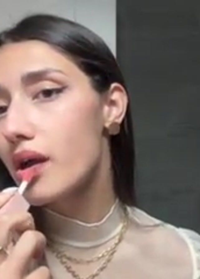 A young woman applies lip gloss in front of a mirror. The woman has long brown hair, light skin, and is wearing multiple necklaces, earrings, and a sheer white top. She is holding a pink lip gloss tube and applying the gloss with the applicator wand. The bathroom setting includes a white cabinet and a glass-enclosed shower.