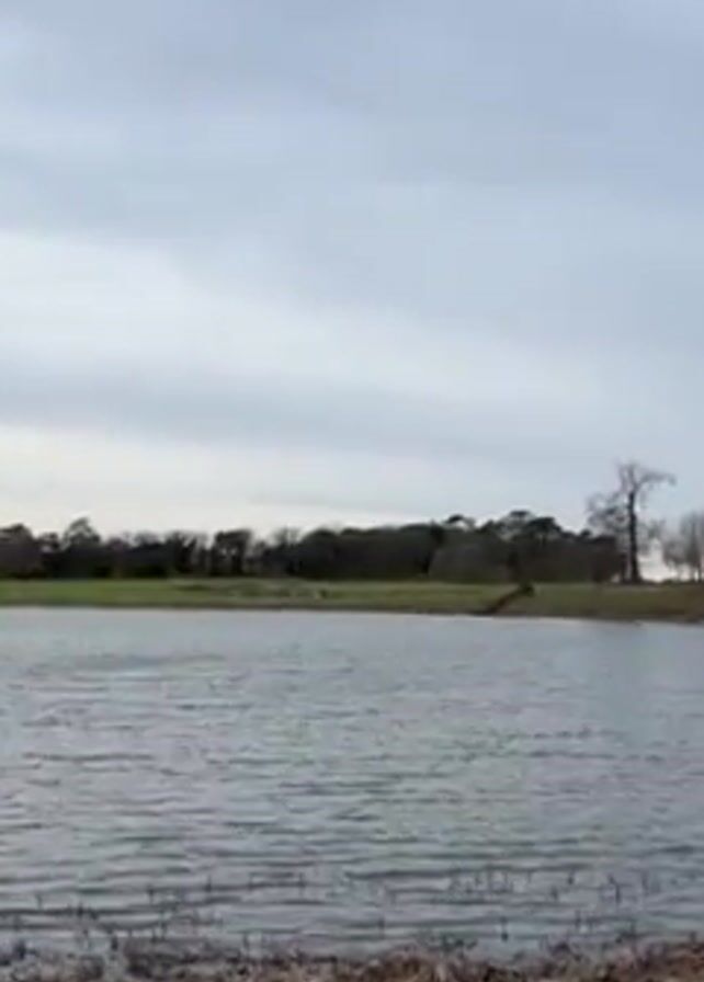 lake on an overcast day, with a grassy shoreline and trees in the background. A large flock of birds is visible on the green field, near the edge of the water. The lake's surface is rippled by the wind.