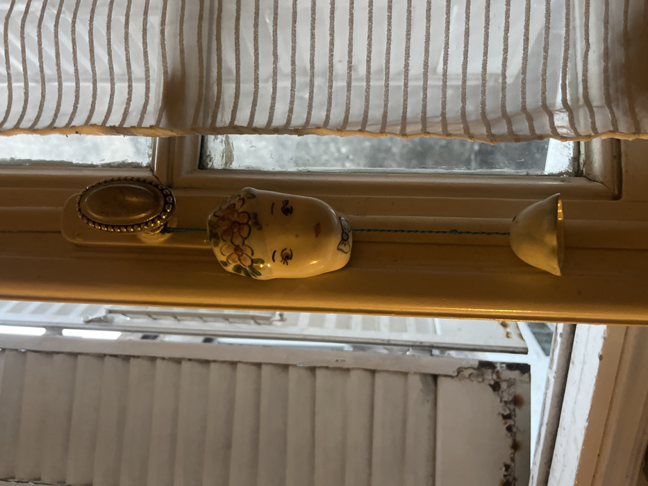 The image presents a close-up interior view of a window within an older building in Buenos Aires, Argentina. A vertical, light yellow-cream painted wooden window mullion occupies the central and right foreground. Mounted on the upper part of this mullion is an oval, brass-toned knob with a beaded border. Suspended from this knob by a thin green cord is a two-component ceramic wind chime. The upper component is an off-white stylized female head, detailed with painted dark eyes, red lips, eyebrows, a blue bow tie below the chin, and a multi-colored floral pattern (brown, orange, green) on its crown. The lower component, a small, off-white, bell-shaped ceramic piece, hangs directly below the head on the same cord. To the immediate right, a sheer white curtain with horizontal stripes is partially visible. To the left, through the window panes, a partially open exterior set of white louvered wooden shutters is visible, displaying significant peeling paint and rust-colored corrosion, consistent with an aged facade. The exterior light is diffuse. This architectural style is typical of historic neighborhoods in Buenos Aires, such as San Telmo or Recoleta.